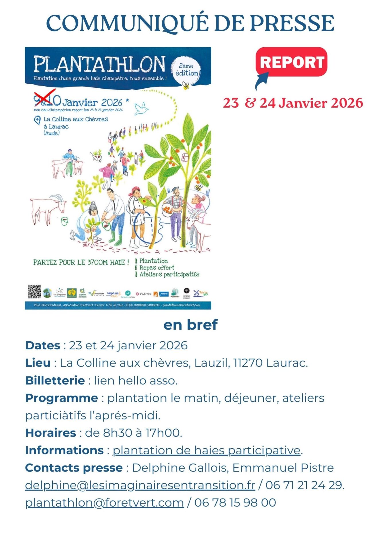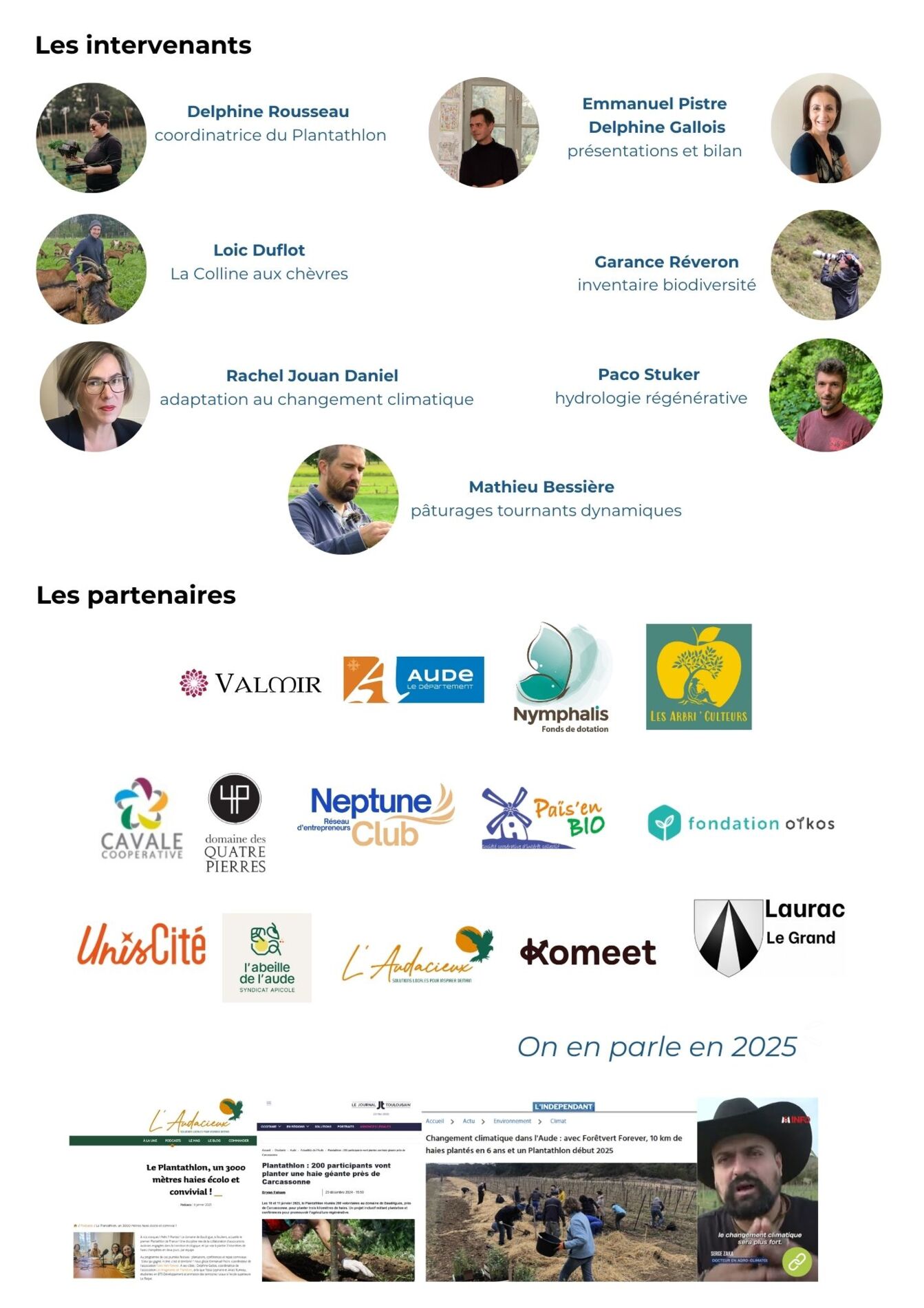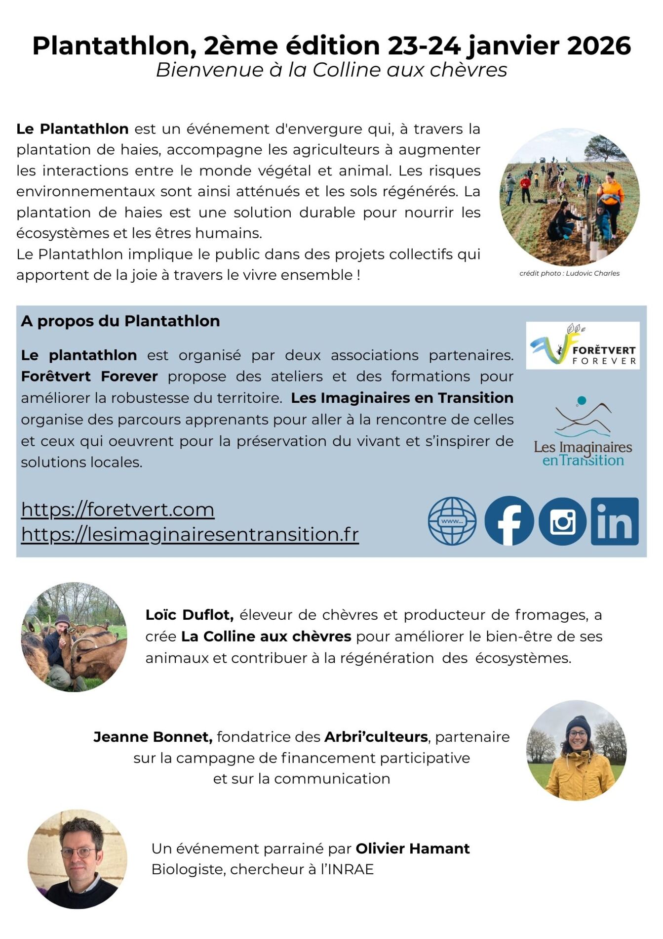 Le plantathlon est organisé par deux associations partenaires. Forêtvert Forever propose des ateliers et des formations pour améliorer la robustesse du territoire. Les Imaginaires en Transition organise des parcours apprenants pour aller à la rencontre de celles et ceux qui œuvrent pour la préservation du vivant et s’inspirer de solutions locales.