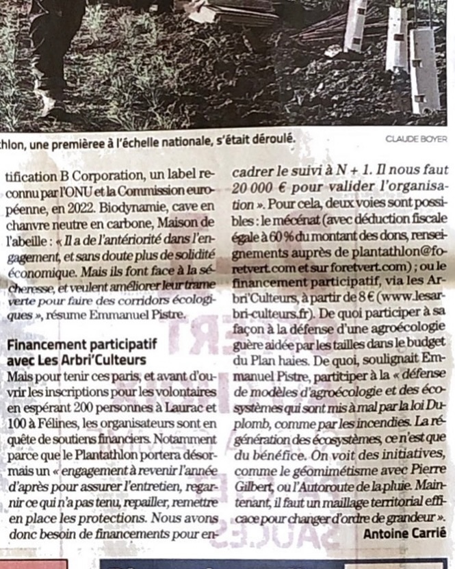 Le plantathlon est organisé par deux associations partenaires. Forêtvert Forever propose des ateliers et des formations pour améliorer la robustesse du territoire. Les Imaginaires en Transition organise des parcours apprenants pour aller à la rencontre de celles et ceux qui œuvrent pour la préservation du vivant et s’inspirer de solutions locales.